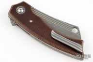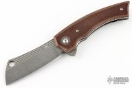 This El Chapo Flipper by David Freeman features a Chad Nichols Damascus blade with notched flipper. The handle has brown canvas micarta scales, satin titanium liners, matching Damascus backspacer, pivot collars and tip up clip with hidden screws. Very nice action, detent, and blade seating. Comes with cloth case and COA dated 6-29-21. Excellent condition.