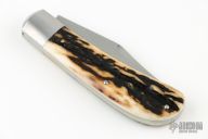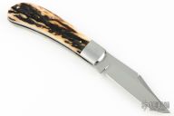 This Lanny's Clip by Mike Zscherny features a hand rub satin finished blade with a nail nick. The handle features stainless steel bolsters, escutcheon and liners, stag covers, stainless steel spring. Has half-stop, flush in all positions. Nice pull! Excellent Condition.  Comes with a zippered case.