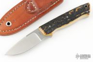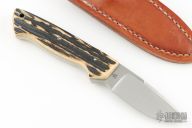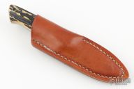 This Drop Point Hunter by Reese Bose features a drop point blade with false top edge, .155" blade stock and 1.163" blade depth, full tapered tang construction. The handle has stag scales with a lanyard hole. Excellent condition. Comes with original brown leather sheath and a zippered case.