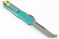 This Combat Troodon Bounty Hunter by Microtech Knives features a Hellhound tanto blade with fullers, satin flats and apocalyptic finished grinds. The handle has a green battle worn aluminum handle with red hardware, tip down apocalyptic finished stainless steel clip.  Includes the original box.  Excellent condition. Dated 02/2023 s/n 2794.