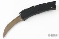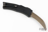This Custom ROC by Heretic Knives features a hand ground bronze tumbled blade with fullers and notched thumbrest. The handle has a black aluminum chasis with a tip down DLC titanium clip with ceramic ball. Abalone inlay in the push button. Comes with original box and COA #143. Excellent Condition.