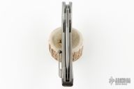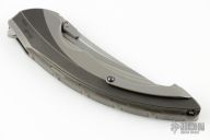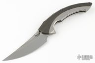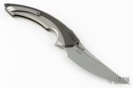 This Lamella by Rike features a two-tone blade with fullers, dual thumbstuds and a flipper. The handle has a a titanium frame and liner, tip up clip with ceramic ball. Comes with original box and papers. Excellent condition.