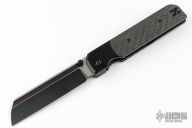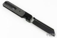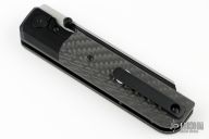 The DLC coated titanium bolster lock is paired with classic weave carbon fiber inlays, DLC hardware and the Knife Standards DLC coated milled titanium clip.
