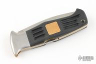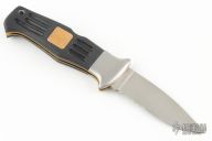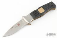 This AL MAR SERE Tactical Folding Knife features a satin finished spear point blade with a partially serrated edge. The handle has stainless steel bolsters, textured black Neoprene with the RARE and limited GOLD Al Mar Chop inlaid on both sides, brass liners, stainless steel spring and backspacer, lanyard hole. Comes with a black nylon sheath. Excellent condition.