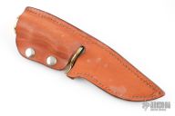 This knife features a polished blade with .165" blade stock and .996" blade depth, hidden tang construction. The handle has a brass guard and butt, pecan wood grip with brass spacers. Comes with a brown leather sheath. Has a couple light scratches and an oxidation spot near the tip, otherwise good condition.