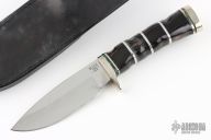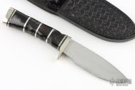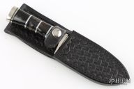 This knife by Buck features a mirror finished blade with .139" blade stock and 1.172" blade depth, hidden tang construction. The handle has a nickel silver guard and butt with buffalo horn grip, nickel silver and aluminum spacers. Comes with a hand tooled black leather sheath. Has a few light scratches and patina, otherwise good condition.