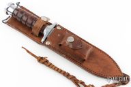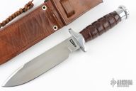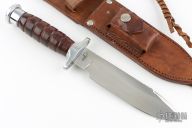 This Survival Knife by Garcia features a satin finished spear point blade with sawteeth on the spine, .139" blade stock and 1.469" blade depth, hidden tang construction. The handle has an aluminum guard, stacked leather hollow handle and removable aluminum butt cap, has storage area in handle. Has a brown leather sheath. Has some light scratches, excellent condition otherwise.