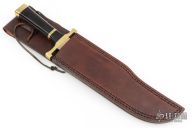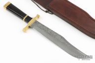 This Bowie by Dan Harrison features a 512 layer Damascus blade (5160 & 1018) clip point blade with a false top edge, .184" blade stock and 1.503" blade depth, hidden tang construction. The handle has a brass guard and pommel with a dark wood grip and a brass spacer. Includes a brown leather sheath with belt loop. Excellent condition.