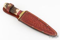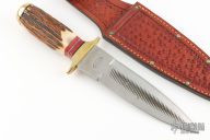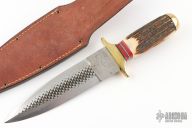 This dagger by Bill Simons features a blade is made from a Simonds farrier's rasp, it has a double edged satin finished blade with .203" blade stock and 1.648" blade depth, hidden tang construction. The handle has a brass guard and butt, stag grip with black/red/white spacers. Comes with a hand tooled brown leather sheath. Has some light scratches and patina, otherwise excellent condition.