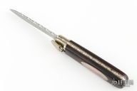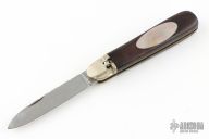 This Boker Leverlock features a drop point blade. The handle is comprised of nickel silver bolsters, wood scales with pearl inlay over brass liners and stainless steel backspring. Has some scuffs, scratches, and patina. Great condition otherwise.