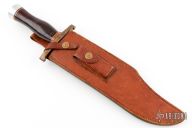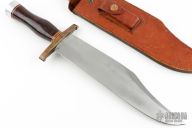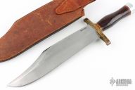This Model 12-11 Smithsonian Bowie by Randall Made Knives features a satin finished carbon steel blade with sharpened top edge, .379" blade stock and 2.38" blade depth, hidden tang construction. The handle has a lugged brass guard and duralumin butt, stacked leather grip with red/white/blue spacers. Comes with a brown leather sheath and a padded zippered case. Has scuffs/scratches and patina otherwise the knife is in good condition given its age.