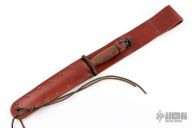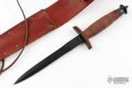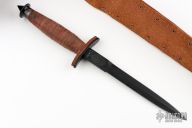 This V-42 1998 Devils Brigade Dagger by Case features a black double edged blade with .171" blade stock and .743" blade depth, hidden tang construction. The handle has a black steel guard, stacked leather grips and black steel butt. Comes with brown leather sheath. Has scuffs and scratches, good condition otherwise.