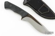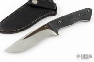 This knife by Jason Knight features a two-tone finished recurved blade with a full tang construction.  .235" Blade Stock.  1.561" Blade Depth.  The handle has sculpted micarta scales.  Includes a black leather sheath and a padded zippered case.  Excellent Condition.
