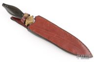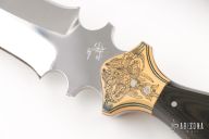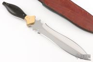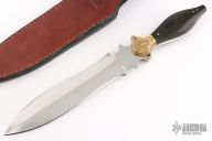 This Dagger by Jon Schulps features a satin finished double edged blade with mirror polished flats, .306" blade stock and 2.045" blade depth, full tang construction. The handle has yellow/black Westinghouse paper micarta bolsters with scrimshaw, black linen micarta scales with stainless steel pins and black liners. Comes with a brown leather sheath. Excellent condition. Scrimshaw is dated '93