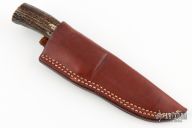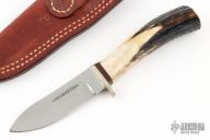 This Nesmuk Skinner by Morseth Knives features a satin finished blade with .178" blade stock and .925" blade depth, hidden tang construction. The handle has a nickel silver guard, stag grip with black/red/brass linen micarta spacer pattern. Comes with a brown leather sheath. Dated 1993. Has some light scuffs, scratches, and patina, great condition otherwise.