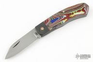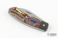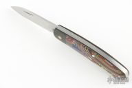 This Dino slipjoint by David Taber features a hand rub satin finished blade with nail nick. The handle has carbo quartz bolsters, Corvette Fordite covers with a blue carbo quartz escutcheon, stainless steel liners and spring. Half stop blade position, flush in all positions. Strong function. Comes with a leather slip sheath and COA dated March 2024. New from maker!
