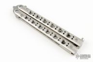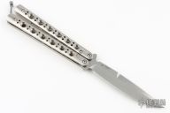 This Model 62 Balisong by Benchmade features a stonewashed spear point D2 blade with a false top edge. The handle has stainless steel handles and latch. Includes the original box, papers and nylon sheath. Excellent condition.