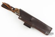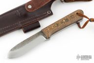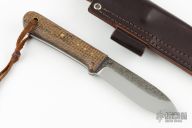 This Kephart by AA Forge features a satin finished blade with hammer marked flats, .158" blade stock and 1.233" blade depth, full tang construction. The handle has brown burlap micarta scales with brass pins and green canvas micarta liners. Comes with a brown leather sheath. Excellent condition.