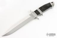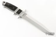 This is a Kressler design integral subhilt fighter by Boker Plus features a mirror polished blade with false top edge, .248" blade stock 1.266" blade depth, integral construction. The handle has integral guard, sub-hilt and butt with lanyard hole and black micarta inlays. Comes with original black leather sheath, box and papers. #0596 on blade spine. Excellent condition.