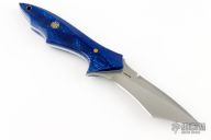 This Reprisal by Jerry Hossom features nicely shaped Blue Juma Snakeskin scales with white liners, brass and mosaic pins. Hand rubbed satin finished blade with sharpened top edge, .145" blade stock and 1.093" blade depth, full tapered tang construction (very mild taper). Fits nicely in hand. Includes a zippered case. Excellent condition.
