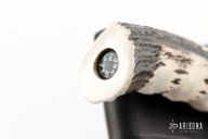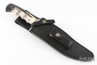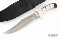This Bear Bowie by Randall Made Knives features a satin finished blade with sharpened top edge, .233"blade stock and 1.636" blade depth, hidden tang construction. The handle has a nickel silver guard, finger grip stag handle with compass in the butt, red/white/blue spacers. Comes with a black leather sheath and original paper wrapping. Comes with a Randall zippered case. Excellent condition.