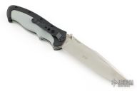 This 10100 LFK Prototype from Benchmade features a satin finished harpoon style blade with swedge, dual thumb studs and notched thumb rest. The handle is comprised black aluminum with gray rubber overlays and an inlaid steel look bar. The interesting thing about this knife is that the blade is obviously larger than the handle. To prevent accidents, a polymer "tail fin" extends to cover the exposed blade edge when closed and retracts as the blade is open. Marked "Prototype" on the blade. Blade Steel: 0.118 440C @ 58-60 HRC". Has a couple light scuffs, excellent condition otherwise.