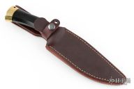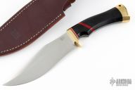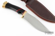 This Marauder by Bark River features a satin finished blade with false top edge, .197" blade stock and 1.700" blade depth, hidden tang construction. The handle has a brass guard and butt, black canvas micarta grip with red/black/white spacers. Comes with original brown leather sheath. Has a couple light scratches, otherwise excellent condition.