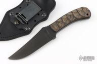 This Special Edition Belt Knife by Winkler Knives II features a Black Ion Bond coated blade with fileworked thumbrest, .215" blade stock and 1.670" blade depth, full tang construction. The handle has scultped canvas micarta scales. Comes with a black leather sheath with mounting hardware, original box and papers. Excellent condition. One of 10 with micarta scales.