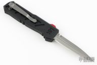 This Epidemic OTF was made by Benchmade for Heckler and Koch. It features a stonewash finished spear point blade with false top edge. The handle is comprised of black machined aluminum with a tip down carry pocket clip. Comes with original box, drawstring bag and papers. Excellent condition.