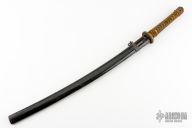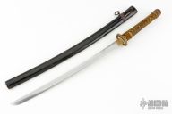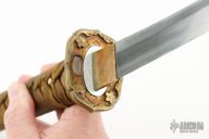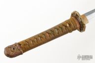 It has a hand rub satin finished blade with a fairly straight hamon, .266" blade stock and 1.185" blade depth, hidden tang construction. Has a brass habiki, fileworked silver seppas, decorative brass tsuba, carved and engraved brass and copper fuchi, brass flower menukis under gold colored Tsuka-Ito with lizard skin, decorative brass kashira gane. The Saya is black laquered wood with steel Kurigata.