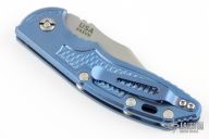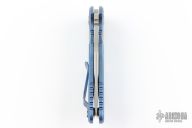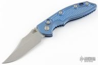This XM-18 Flipper by Rick Hinderer Knives features a 3.5" stonewashed finish blade, notched thumbrest and flipper.  The handle has a stonewashed blue titanium frame with a matching tip up pocket clip. Comes with original box and papers. Excellent condition.