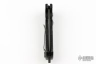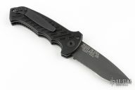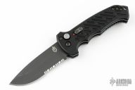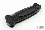 This 06 Side Opening Auto has a matte black finished S30V drop point partially serrated blade. The handle is black aluminum over black stainless steel liners, exposed stainless steel tang butt/ glass breaker/ backspacer with lanyard hole, black stainless steel tip up (RH/LH reversible) clip, and safety button. Has some light scuffs, otherwise excellent condition.  Comes with original box and papers.