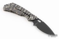 This PT by Mick Strider features a black blade with notched thumbrest and thumbhole. The handle has a Disruptive Strider Stripe finished titanium frame with matching tip up clip. New from maker.