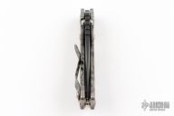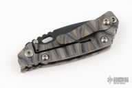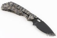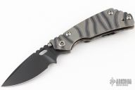 This PT by Mick Strider features a black blade with notched thumbrest and thumbhole. The handle has a Disruptive Strider Stripe finished titanium frame with matching tip up clip. New from maker.