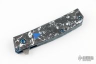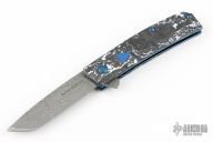 The Benchmade 601-211 Gold Class Tengu is a fully upscale version of the popular 601 flipper. This special edition knife features BiFrost Pattern Damasteel blade, white/black marbled carbon fiber scales, dual blue G-10 inlaid shields, sapphire blue PVD coated stainless steel liners and hardware, Raffir UV reactant SFX Blue Uranium with imbedded brass mesh backspacer. #2525. Excellent condition. Comes with original box and papers.