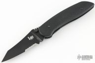 The H&K Scorch Prototype features a unique dual-action design. The black blade has a reverse tanto design with notched thumbrest and dual thumbstuds. The handle is textured black G-10 with black stainless steel liners and tip down clip. Comes with H&K drawstring bag and box. Has a couple light scuffs, otherwise excellent condition.