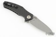 This 0770CF Linerlock Flipper (#31928) has a stonewashed drop point blade with notched thumb rest. Handle is carbon fiber with stainless steel single liner (lock), and black stainless steel tip up clip (RH/ LH reversible). Nice action, lockup and blade seating. Excellent condition.