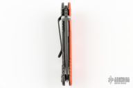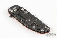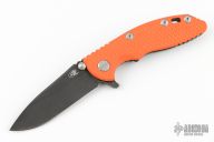 This 3" XM-18 flipper from Hinderer Knives has a battle black blade with notched thumbrest and flipper, no choil. Orange G-10 scale and a battle black finished titanium frame and pocket clip. Reversible pocket clip. Strong lock up, nice detent and blade seating is center. Includes original box, extra bushings and papers. Excellent condition.