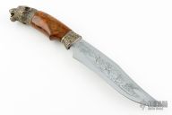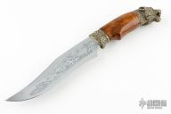 This knife by Armenian Doctor Knives features a mirror polished blade with etched scenes on both sides, .165" blade stock and 1.582" blade depth, hidden tang construction. The handle has a cast brass guard and butt with wood grip. Comes with a wooden display stand with matching cast brass fittings. New from maker.