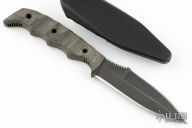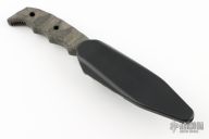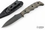 This Dynamis Alliance fixed blade was crafted by Daniel Winkler. IT features a spear point blade with sharpened top edge and notched thumbrest. The handle is comprised of sculpted black canvas micarta scales over full tang construction. Jimping on pommel provides purchase when holding in the reverse grip. Includes a molded plastic sheath with metal clip. Includes original box. Has a few light scuffs, otherwise excellent condition.