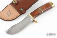 This knife by Chubby Hueske features a polished blade, .249" blade stock and 1.399" blade depth, hidden tang construction. The handle has brass guard, spacer, and butt. Wood grip. Comes with a brown leather sheath and zipper case. Has some scuffs, scratches, and patina, great condition otherwise. The back of the sheath is signed.