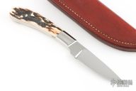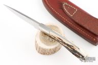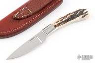 This knife by George Herron features a mirror finished blade with .127" blade stock and .730" blade depth, full tapered tang construction. The handle has stainless steel bolsters and stag scales. Comes with a brown leather sheath with belt loop. Excellent condition. #1804