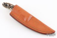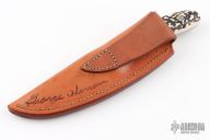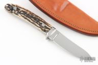 This New Style Knife by the late George Herron features a high polish drop point blade, The handle is comprised of a stainless steel guard and stag scales over black liners and full tapered tang construction. Numbered 2479 on bottom side of tang. Includes leather sheath with belt loop. Excellent condition.