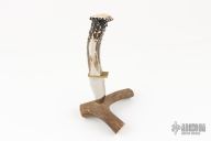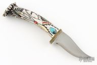Cherokee Knife Maker, Ted Miller is an American Indian Artisan, of Miami-Peoria-Cherokee heritage. He has won over fifty significant awards. He carves images of his heritage and culture from stories passed down through his ancestors. Ted makes the handles for his knives from natural shed Deer and Elk Antler enhanced with semiprecious stones such as turquoise, coral, and onyx. Black handles are made from Buffalo horn. The blades for the knives are hand-shaped, sharpened, polished and heat-treated individually from 440C stainless steel, 56-60 Rockwell, and acid etched designs are worked on the larger blades . Stands shown are included in the price. All knives are shaped and balanced to provide a perfect grip for the sportsman as well as the ultimate in arts acquisition for the collector. Some handles may be similar in nature or design but each is an original piece with no two being exactly alike. Each knife is individually numbered and comes with a certificate of authenticity