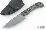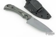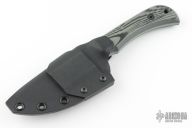 This Cav by Half Face Blades features a grey coated blade with a notched thumbrest, .156" blade stock, 1.480" blade depth, full tang construction.  The handle has grey/black G-10 scales. Comes with a kydex sheath with clip. Excellent condition. This one has the old Cav logo.