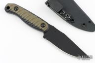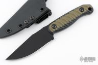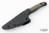 This Featherlite by Half Face Blades features a black cerekote blade with a notched thumbrest, .115" blade stock, 1.138" blade depth, full tang construction.  The handle has black/green G-10 scales.  Comes with a kydex sheath with clip. Excellent Condition.
