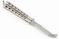 This early balisong from Pacific Cutlery features a Jody Samson ground satin finished blade with sharpened top edge. The handles are stainless steel with hole pattern. Has some light scuffs and scratches, excellent condition otherwise. Comes with original nylon sheath.