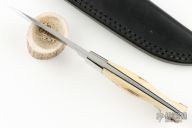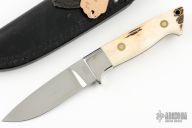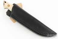 This knife by Tak Fukuta features a mirror polished blade with .185" blade stock and 1.073" blade depth, full tapered tang construction. The handle has a mirror polished guard and stag scales with black liners. Comes with a brown leather sheath. Has some light scuffs and scratches, excellent condition otherwise.