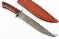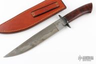 This Bowie by Master Smith Steve Randall features a hand rub satin finished blade with nice hamon and false top edge, .230" blade stock and 1.459" blade depth, hidden tang construction. The handle has a blued steel guard and collar, desert ironwood burl grip. Comes with a hand tooled brown leather sheath with belt stud. This knife wears his Journeyman Smith mark. It appears that the knife was stuck into something, or the sheath over a long period of time, it has some pitting and staining on the blade, but honestly, at first I thought it was intention and looked pretty cool, but it is not. Comes with the original COA dated January 15, 2014. It also comes with a copy of the listing where it was sold last with a picture of how it looked originally before the damage. The knife is still functionally good and would make a really nice user. The knife looks completely unused besides the pitting and staining marks, but doesn't have any scratches that would indicate it has been used. Still a beautiful knife.