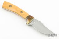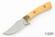 This hunter by Barbee features a mirror finish clip point blade of .185" thickness and 1.146" depth. Full tang construction, notched thumbrest. Stamped #2411. The handle has brass dovetail bolsters with micarta grip. Comes with a zipper case. Has some light scuffs, scratches, patina, excellent condition otherwise.